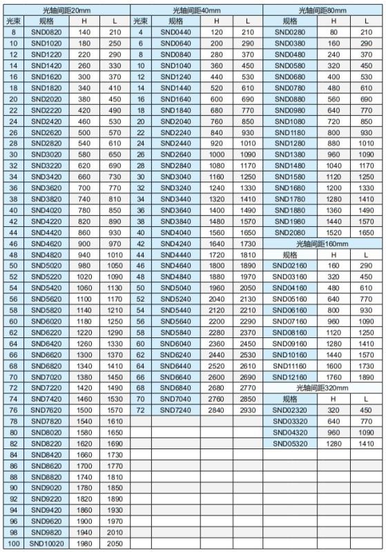 Note: The above is the standard version SND/E safety light curtain selection table. For the multifunctional SND/E safety light curtain with an optical axis spacing of 20mm, its beam starts from 8 channels and increases by 4 channels, as shown in Figure