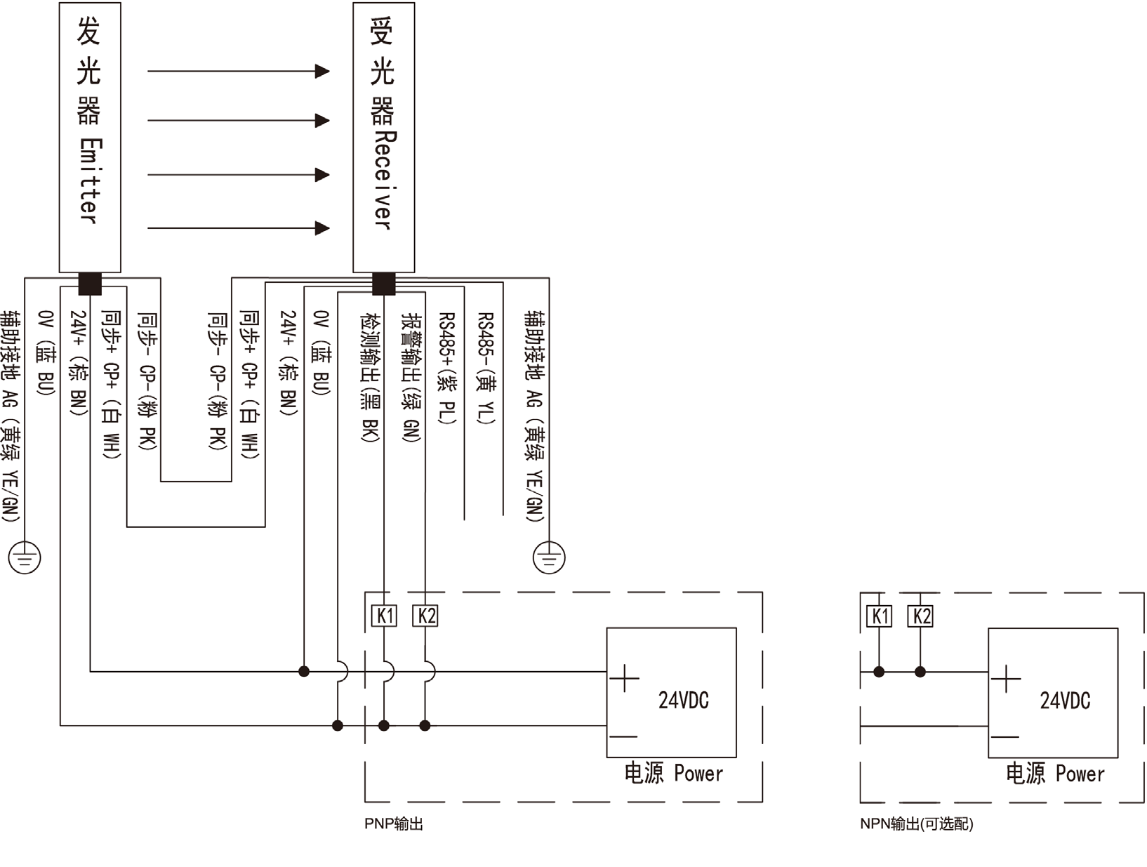 | 輸出 | 雙路晶體管輸出(PNP或NPN),負載電流120mA, 1路報警輸出、1路檢測輸出(出廠設定為連續遮擋6束光) |