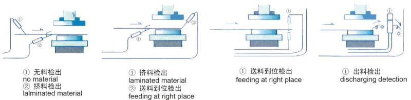 在沖床自動(dòng)沖壓加工過(guò)程中,預(yù)防模具損壞和不良品的產(chǎn)生。具有擠料(波動(dòng))檢出、無(wú)料(材料末端)檢出,送料到位檢出、出料檢出等多種監(jiān)測(cè)功能。
