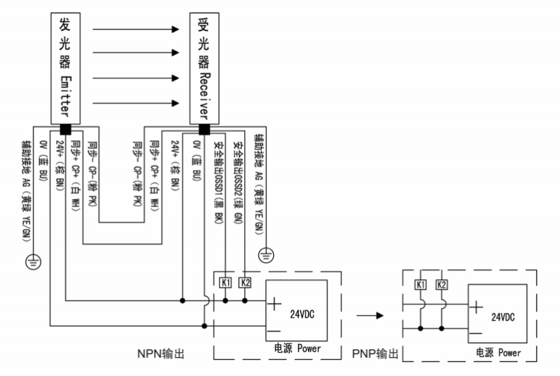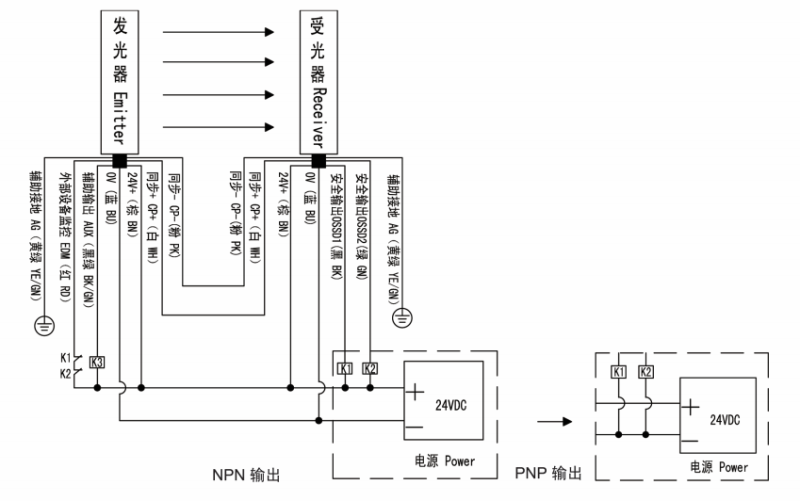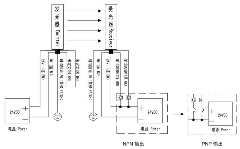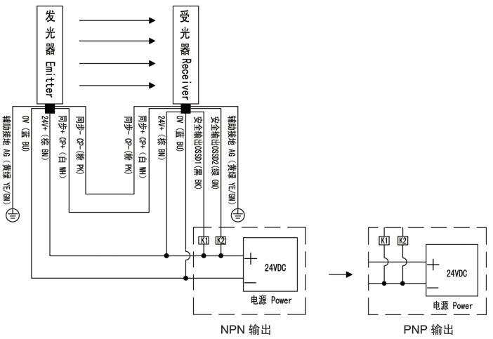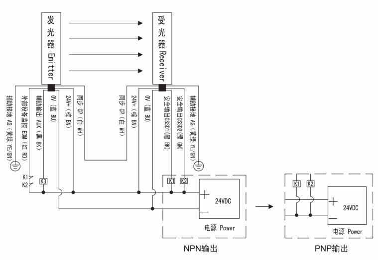 SND/E系列安全光幕NPN/PNP輸出接線: