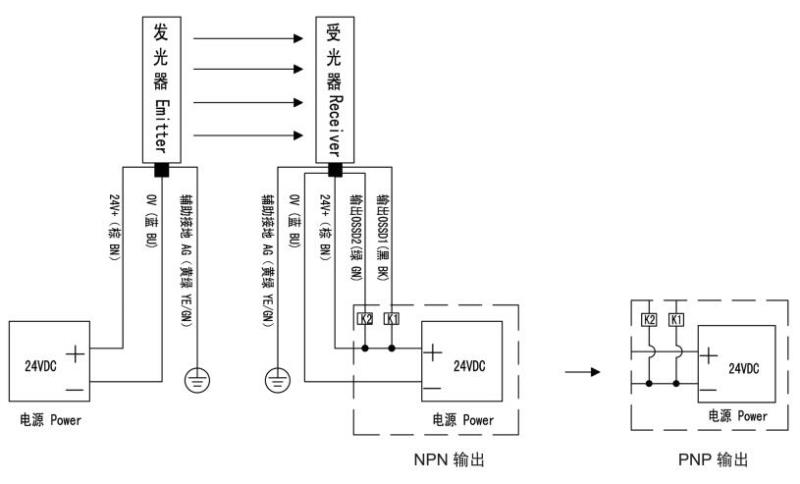 S4系列安全光幕NPN/PNP輸出接線: